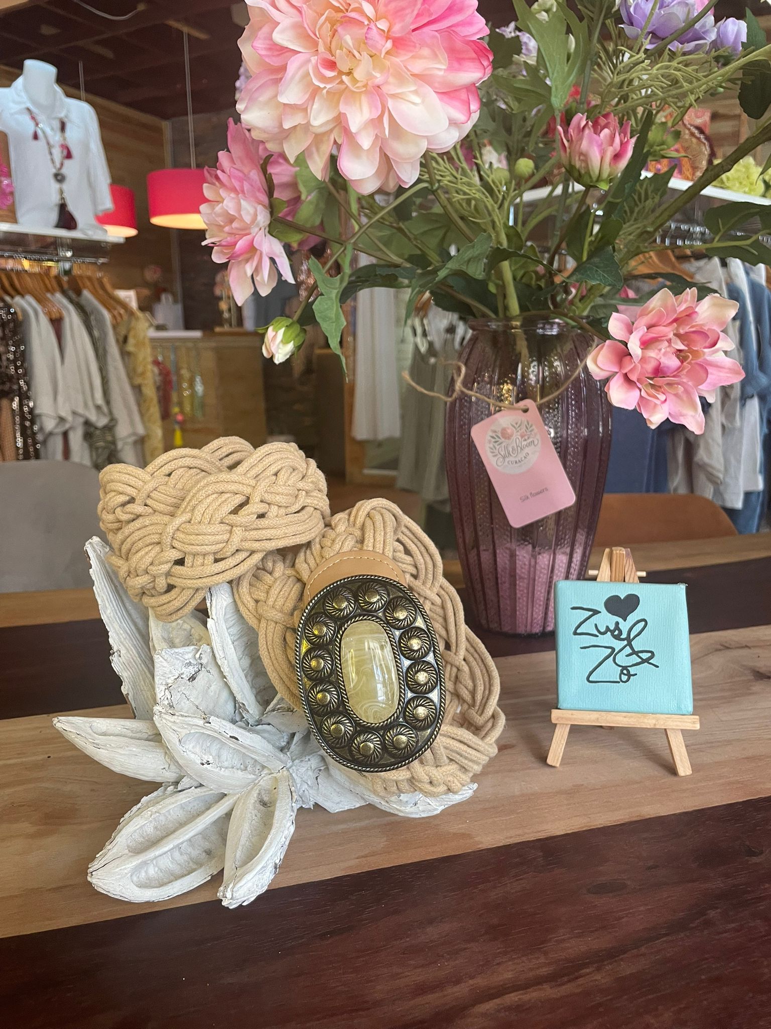 Add a touch of boho style to your outfit with this braided fabric belt. The woven design combined with a bold stone buckle creates a unique and eye-catching look. Perfect for styling with dresses, jeans, or a relaxed summer outfit.